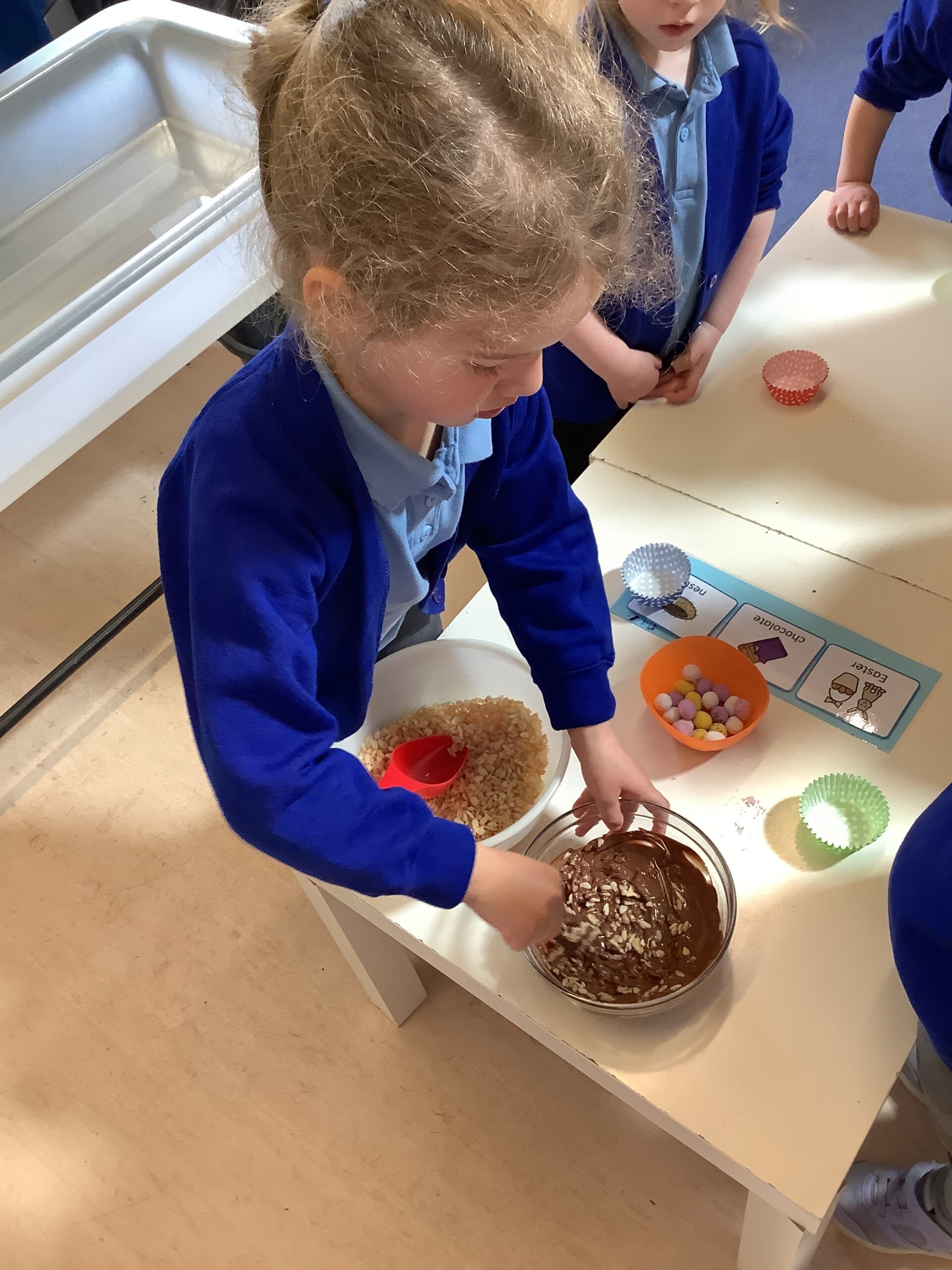 During our last week of term, we have been learning about the celebration of Easter. We listened to the Easter story and talked about how we celebrate Easter with our families. We made our own chocolate nest cakes and an Easter wreath. In our Explorer time, we planted sunflower and marigold seeds to take home.